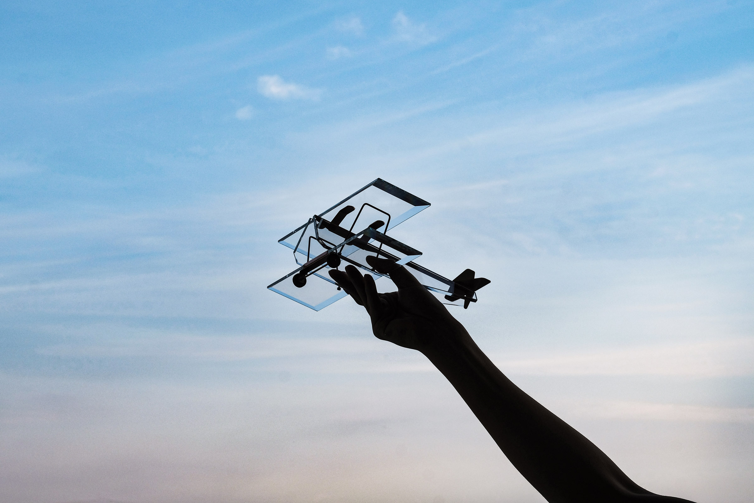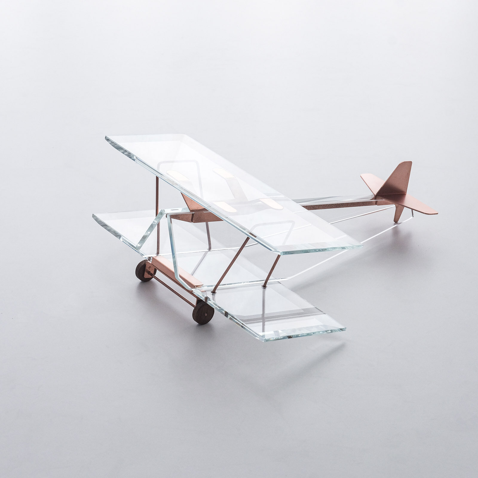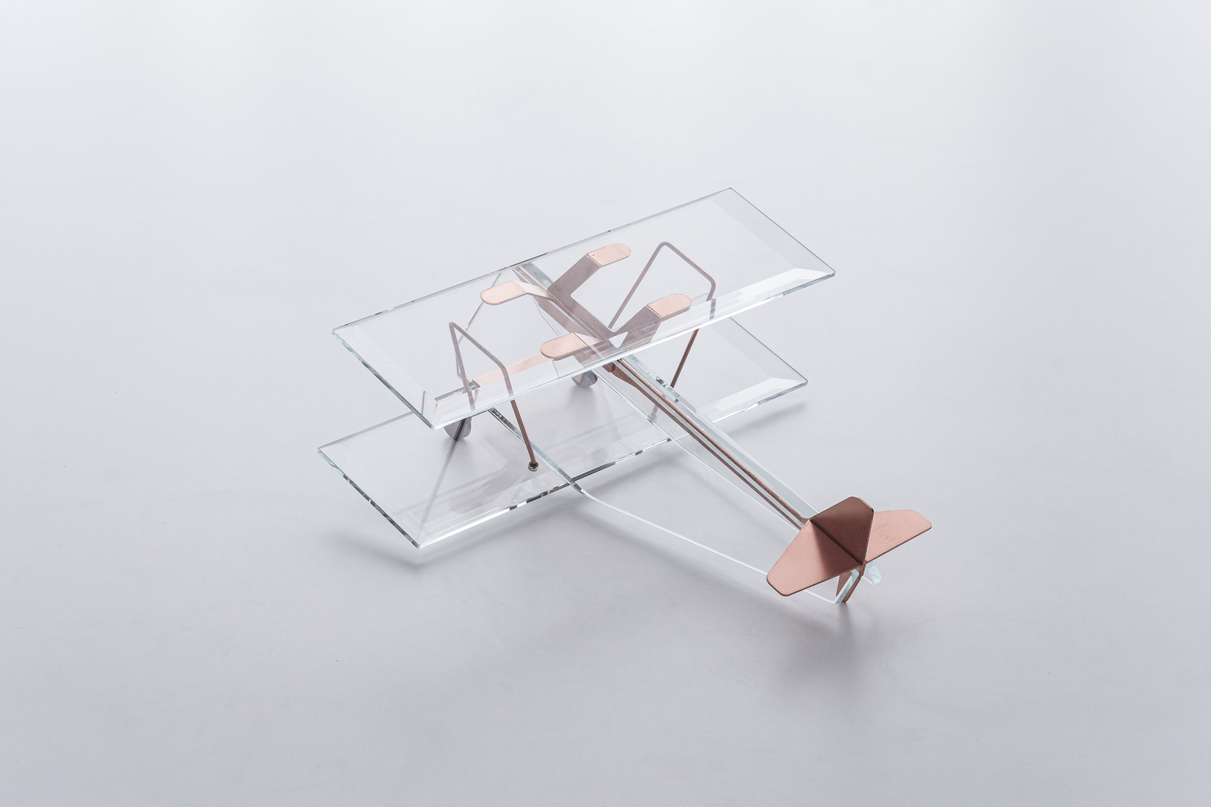 I had a small glass cut sample that I was prototyping for a project. While I was casually looking at it, an image suddenly came to me, and I gave shape to it as an aeroplane object. There was no particular purpose, no plan to present it, no background to talk about, and it was just quietly displayed by the window as one of my design studies, but it had a somehow cute appearance, and the shine reflected by the light from the window and the overlapping shadows falling through the multiple glass pieces were beautiful, and I secretly felt I felt attached to it.